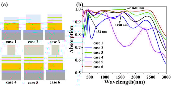 Since the size structure of the model largely determines the SPR of the nanomaterials and thus the absorption properties, there is a pressing need to analyze the different shape structures []. Figure 5a shows six cases of different shape structures. Figure 5b shows the absorption of the six different model structures at incident light wavelengths of 280 nm–3000 nm. In these six cases, the structural parameters of the material and the thickness and radius of the film and disc are the same.
