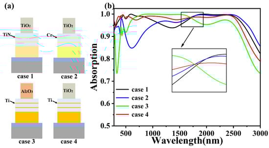 In order to confirm the superiority of the chosen material, we replaced the material in the structure in order to study its absorption properties, as shown in Figure 6. Since the broadband absorption of our designed absorber is a result of the combined effect of the SPR properties of the material and the multiple Fabry–Perot resonances in the cascade optical cavity [], this also confirms the excellent fit of the absorption between the designed TiO2, SiO2, and Ti discs. In order to investigate whether there is that kind of coupling between combinations of other materials, we verified it with the absorption efficiency. For this purpose, we compared cases 1 and 2 and case 4 by replacing the SiO2-Ti cascade optical cavity discs with SiO2-TiN versus SiO2-Cr structures for observation, respectively. TiN is a better refractory and high-temperature-resistant material than Ti and is commonly used in the fabrication of a wide range of solar absorbers []. After the replacement of the SiO2-TiN cascade optical cavity, the absorption in the near-infrared range was unstable, the absorption spectrum showed obvious fluctuations, and the absorption effect in the band never exceeded that of Ti, which is obviously not the result we want. The absorption after replacing the precious metal Cr was even more obviously decreased and unstable, so we did not carry out too much research on this. In case 3, we replaced the top TiO2 disc with another kind of oxide, Al2O3. As can be seen in Figure 6b, case 3 makes up for the disadvantage of the absorption of the TiO2 disc near 1500 nm, but with an increase in NIR wavelengths after 1500 nm, this advantage is rapidly weakened, and the average absorption rate of the disc is 94.54% from 280 nm to 3000 nm, which is far inferior to that of our designed material. For this reason, we chose the SiO2-Ti optical cavity, with stable absorption at 280 nm–3000 nm.