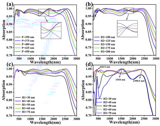 The complex structure of our design makes it difficult to manufacture the absorber, so in daily industrial production, the product will have unavoidable errors. In order to study the effect of these small errors on the absorber, we chose four typical structural parameters in order to explore their effect on the absorber’s absorption. Figure 7a shows a light absorption diagram of the structure with the period increasing from 350 nm to 450 nm and a period interval of 25 nm, and it can be seen that the absorption of the absorber fluctuates over a large range in the whole wavelength band, no matter whether the period, P, is increased from 400 nm to 450 nm or decreased to 350 nm. In the visible band, the absorption at P = 400 nm is more stable than all the other parameters. Figure 7b shows the absorption spectra of the Ti disc in the last resonant cavity in the cascade optical cavity with the height, D2, increased from 100 nm to 200 nm. During the electric field analysis of the absorber, we learned that the strong absorption of visible light is caused by the coupling of the SPR of the TiO2 disc with multiple Fabry–Perot resonance modes at the junction of the Ti and SiO2 discs. So, as D2 increases, it enhances the Fabry–Perot resonance in the cascade optical cavity, which explains why the absorber absorbs better than at D2 = 150 nm in the visible band when D2 increases from 150 nm to 200 nm in Figure 7b. However, after that, in the near-infrared wavelength band, this advantage quickly ceases to exist as the Fabry–Perot resonance decreases for the absorber. Figure 7c,d show the variation in the structural parameters for two thicknesses of the Si film, H1, and the SiO2 disc, H2. In the absorber, the Si film in the substrate does not participate in the near-field coupling; it serves to enhance the multiple absorptions of sunlight in the cascade optical cavity, which largely determines the absorption of light in the absorber. As shown in Figure 7c, with the increase in H1 to 30 nm so that the light is absorbed several times in the cavity, it can be clearly seen that the absorption in the near-infrared wavelength band is gradually enhanced, and the average absorptions in the range of 780 nm–2500 nm are 96.13%, 97.57%, 98.6%, 98.75%, and 98.95% in that order. However, this does not mean the larger the thickness of H1, the better, and this effect is seen in general in the visible wavelength band. After continuous optimization, H1 = 50 nm was finally determined to be the optimal parameter. Figure 7d shows that the absorption of the SiO2 disc with thickness H2 in a multilayer absorbing structural layer increased from 30 nm to 70 nm. As can be seen from the figure, our design of H2 = 50 nm is always in the middle of the five cases for a given range of wavelengths, and an efficient and stable absorption case is desirable.