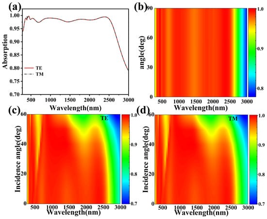 For solar absorbers, it is usually necessary to take into account that the actual sunlight is incident from more than one direction, which requires that the absorber we design fulfill the requirement of being angle-insensitive []. As shown in Figure 8a,b, we simulate the absorbance maps of the absorber in TE (red) mode and TM (black) mode and give the normalized absorption spectra when the normal polarization angle is varied over a range of 0°–90° (TM polarization to TE polarization). We can find that the absorption curves of the two modes completely overlap, and there is no change in the absorption at each polarization angle as the polarization angle increases from 0° to 90°, which is due to the fact that we designed the structure to be completely symmetric. Figure 8c,d show spectral plots of the change in absorbance in the TE and TM modes with the incidence angle varying from 0° to 60°. In this case, the absorption spectra of both the TE and TM polarization modes are the same, and the average absorptivity of the absorber remains at 88.22% in both polarization modes. Ultra-broadband perfect absorption is achieved at a bandwidth of 2263.5 nm (280 nm–2543.5 nm) (A > 80%) when the angle of incidence is increased up to 60°. It was also found that the permittivity of the waveguide layer decreases as the angle of incidence is increased, which leads to the phenomenon of absorption blueshift [,,,]. The results show that our designed symmetric broadband absorber can absorb independent of polarization as well as being insensitive to the incident angle.