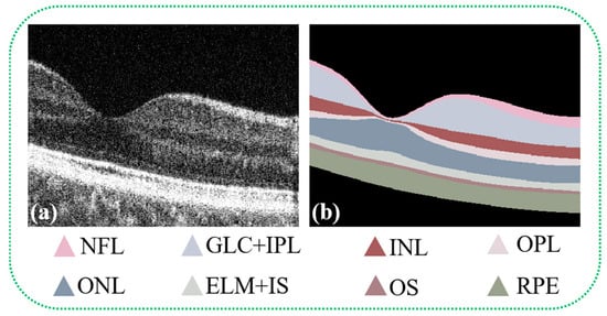 OCT B-scan images display the retinal layers of healthy human eyes alongside annotations of each specific retinal tissue layer. Figure (a) presents the original B-scan image of the retinal layers, while Figure (b) illustrates the annotated ground truth, identifying the eight distinct layers of the retina: the Nerve Fiber Layer (NFL), Ganglion Cell Layer + Inner Plexiform Layer (GCL + IPL), Inner Nuclear Layer (INL), Outer Plexiform Layer (OPL), Outer Nuclear Layer (ONL), External Limiting Membrane + Inner Segments (ELM + IS), Outer Segments (OS), and Retinal Pigment Epithelium (RPE). Annotations for regions classified as background are also included.