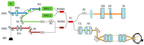 System setup for vnOCT for human retinal imaging. BD: beam dump; PC: polarization controller. EFs: two edge filters.