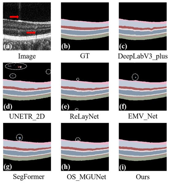Segmentation effects of the model under the influence of noise and artifacts. Panel (a) displays the original image, and panel (b) shows the ground truth. The prediction maps are generated via various segmentation methods: DeepLab_v3+ in panel (c), UNETR_2D in panel (d), ReLayNet in panel (e), EMV_Net in panel (f), SegFormer in panel (g), OS_MGUNet in panel (h), and our proposed method in panel (i). Each panel demonstrates the effectiveness of the respective methods in segmenting the complex structures of the retinal layers.
