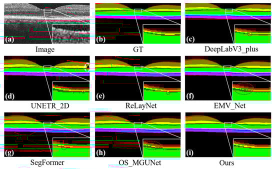 Predicted maps of retinal layer segmentation for randomized test images from the NR206 dataset. Panel (a) displays the original image, while panel (b) shows the ground truth. The subsequent panels illustrate the prediction maps generated by various segmentation methods: DeepLab_v3+ in panel (c), UNETR_2D in panel (d), ReLayNet in panel (e), EMV_Net in panel (f), SegFormer in panel (g), OS_MGUNet in panel (h), and our method in panel (i). Additionally, each panel includes a zoomed-in view to highlight the local details of the predictions, providing a closer look at the segmentation accuracy of each method.