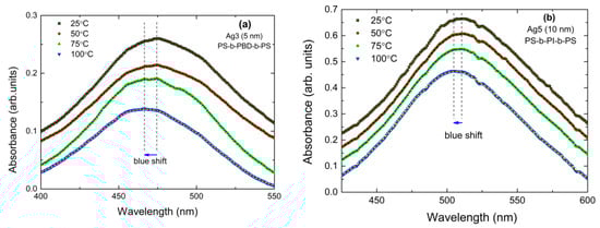 Regarding the temperature-dependent UV-Vis spectra, data were recorded using a Hitachi XX UV-Vis spectrophotometer (Hitachi, Tokyo, Japan) equipped with the temperature-control system, Unisoku cryostat (Unisoku, Osaka, Japan). The system allows temperature control within the range of ambient temperature up to 1000 °C using an N2-heating stream [62]. The measured nanostructured films were placed into a quartz cuvette (3 × 1 × 1 cm), which was filled with an inert solvent to allow heat equilibrium between the nanoparticles–copolymer system and the liquid phase.