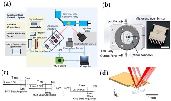 The microcantilever detection system, as illustrated in Figure 2a, comprises a temperature–controlled cell, optical detection components, and a fluid control system. The cell houses the OCTO–500S microcantilever array (MICROMOTIVE, Germany), which features eight cantilevers (500 μm long, 90 μm wide, and 1 μm thick) with a 250 μm spacing. The cantilevers feature a gold layer on the top surface and a titanium bonding layer on the bottom, providing stability and the desired reactivity. The cantilevers feature a gold layer on the top surface, which enhances their reflectivity, improving the signal–to–noise ratio of the optical readout, and allows for potential functionalization through the formation of strong thiol bonds. A titanium bonding layer on the bottom provides stability during reactions.