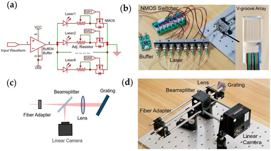The electrical connections, circuit design, and optical detection setup. (a) A schematic of the electrical connection. (b) A photograph of the circuit boards, multiple lasers, and V–groove array. (c) A schematic of the custom–built 100 kHz spectrometer. (d) A photograph of the custom–built spectrometer.