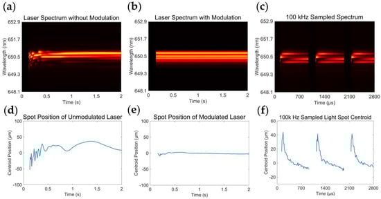 To investigate the system’s response to high–frequency modulation, we conducted experiments comparing the laser spectrum and centroid spot position under both modulated and non–modulated conditions. Initially, we captured the laser spectrum and centroid spot position using a 10 ms sampling window at a frame rate of 100 Hz, corresponding to Figure 4a–e. During this 10 ms exposure time, the camera integrates the light from the laser, which is modulated at a higher frequency.