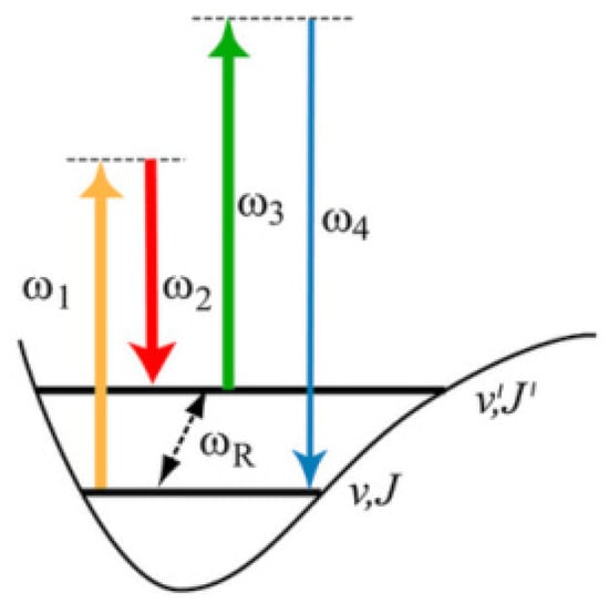 Schematic of molecular states and the CARS signal generation process. v,J and v’,J’ are different rovibrational states, and ωR is the Raman resonance frequency of the medium molecule [32].
