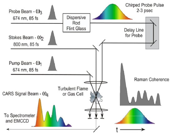 However, femtosecond time-resolved CARS has some inherent drawbacks. Firstly, the traditional time-resolved CARS spectroscopy system is complex and expensive [68,69], and secondly, the measurement process needs to take points several times, which makes the technique unable to achieve the measurement of transient processes. Furthermore, for samples containing multiple components to be measured, the center wavelength of the laser needs to be changed continuously to obtain the CARS spectral information of each component in the sample, which is not conducive to practical applications [70,71,72]. Due to these limitations, this technique has not been studied much in temperature measurement, while femtosecond single-pulse CARS thermometry has received attention, which mainly includes femtosecond/picosecond hybrid CARS spectroscopy and chirped probe pulse femtosecond CARS spectroscopy, which allows for transient measurements of the combustion field with a high time resolution.