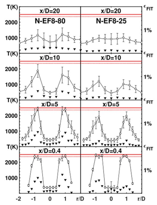 The radial profile of the mean temperature of the dilution spray (N-EF8-80) and the dense spray (N-EF8-25) at x/D = 0.4–20; x/D represents the length ratio to total length, the inverted triangles represent fitting errors, and circles represent temperature [79].