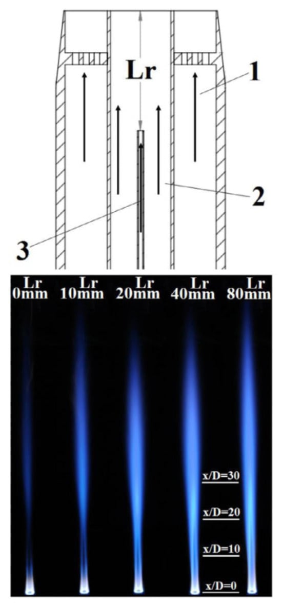 Long-exposure (1 s) images of samples with acetone flame at different recess lengths; x/D represents the length ratio to total length, with the pilot stream in channel 1, the main air jet stream in channel 2, and the liquid fuel stream in channel 3 [85].