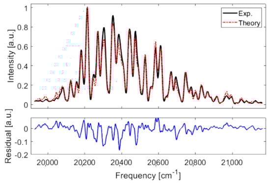 H2 CPP-fs-CARS spectra in a Hencken burner flame with theoretical fit at an adiabatic flame temperature of 2129 K and 0.1 MPa (1 atm), where the blue lines represent the residuals, meaning the difference between the actual observations and the model predictions [14].