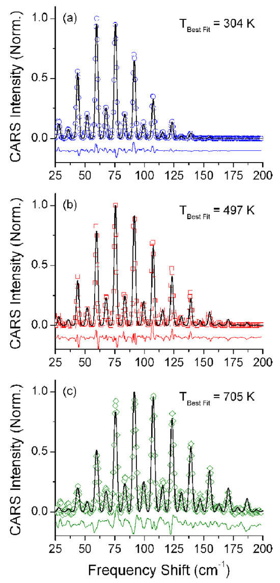 Single-shot pure rotational hybrid fs/ps CARS spectra of N2 at (a) 306 K, (b) 500 K, and (c) 700 K, where open symbols represent experimental data while solid lines represent best-fit simulations [92].
