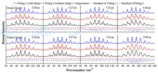 Comparison between the fitting results of the modified model (with probe chirp) and the original model (without chirp). Two groups of coherent anti-Stokes Raman scattering spectra of N2 (black solid lines) with different probe chirps are fitted [100].