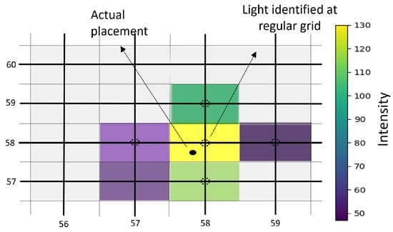 Achieving precise positioning of the light spot on an image plane is important to ensure optimal measurement accuracy. For instance, in a system with lower resolution and increased separation between the Tx and Rx end, the inter-pixel distance on an image plane may exceed a centimeter. In such scenarios, the actual placement of light at an integer number of pixels is not always the case as shown in Figure 2. A new non-integer coordinate must be derived to determine the light position accurately. Therefore, a simple algorithm is adopted to achieve a better light spot position on an image plane. This algorithm can be implemented on embedded devices without requiring high CPU resources.