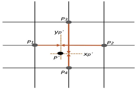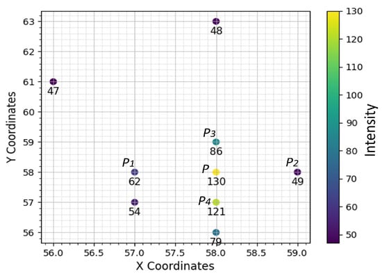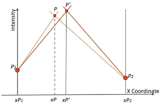 The neighboring pixels and are considered on the x-axis, as depicted in Figure 3, and and on the y-axis. The average intensities of three consecutive points are calculated, and values are linearly distributed along each point to obtain equal distances between pixels. For instance, the average intensity between , P, and is calculated as: