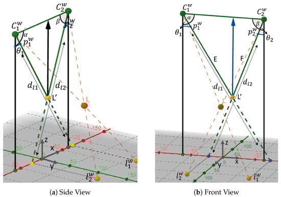 For ease of representation, the World Coordinate System (WCS) coordinates of , , and L are expressed as , , and , respectively. The projection points of the LED onto the reference plane are denoted as points and , and their coordinates are represented as and , respectively. Similarly, the projection points of the LED onto the image plane are denoted as points and , with coordinates and , where and correspond to the focal lengths of Camera 1 and Camera 2, respectively.