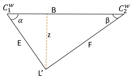 Given the angles and , along with the baseline distance B between the cameras, the two sides of the triangle are determined by the following expressions: