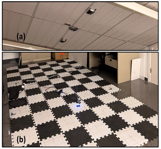 Real experimental setup (a) Three cameras fixed on the ceiling. (b) LED on the floor at regular measured grid.
