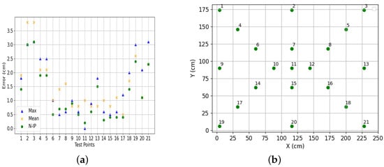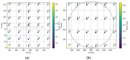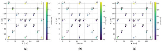 Figure 15 depicts the distribution of 3D positioning errors with various camera arrangements. The small circle in each figure represents the camera placement. In Figure 15a, three cameras are arranged linearly along the x-axis, covering an area of 120 × 180 cm, resulting in an average error of 1.83 cm. The analysis shows that points closer to the center (at 90 × 45 cm) exhibit lower errors, maintaining an average error of 1.4 cm. Figure 15b shows the distribution of errors with the cameras placed equidistantly in a triangular configuration covering an area of 150 × 90 cm. The errors within a radius of 45 cm reach 1.2 cm. Hence, with the current arrangement, the triangular configuration offers slightly better average accuracy than the linear arrangement. In a real deployment, these camera layouts could be extended to cover the entire surface. This would provide redundancy between the deployed areas and help to improve the errors observed at the edges, as these points would be in the vicinity of other cameras. In this respect, the results obtained in the central part (e.g., the inner part of the circle in the triangle arrangement) can be extrapolated to larger deployments.