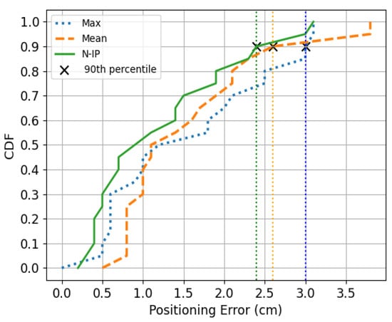 Three different approaches are considered to obtain the position of the LED: (a) the highest, where the LED position is determined based on the pixel with the highest intensity value in the image; (b) the mean, where the LED position is calculated by averaging the positions of the two pixels with the highest intensity values; and (c) the non-integer, which employs the proposed algorithm. Figure 9 illustrates the positioning errors (PEs) obtained from these approaches. For a clearer analysis, Figure 10 and Figure 11 show comparative analysis and cumulative distribution (CDF) for each method.
