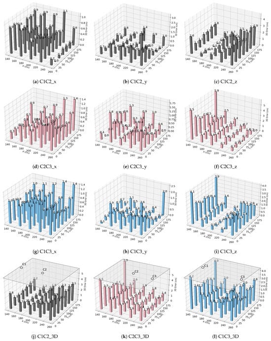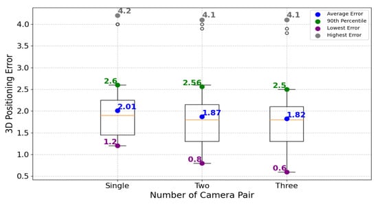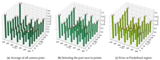 The results from the above approaches are shown in Figure 13, and a summary is provided in Table 4. The average errors in both the x and y directions for each camera pair do not surpass 1 cm, and the average error in the z dimension is under 2 cm. The mean 3D error for approaches (a), (b), and (c) are 2 cm, 1.5 cm, and 1.4 cm, respectively.
