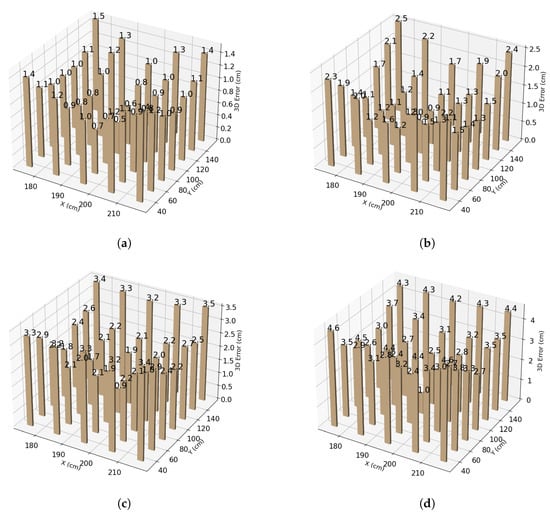 Three-dimensional positioning error at (a) h = 0 cm; (b) h = 15 cm; (c) h = 35 cm; (d) h = 70 cm.