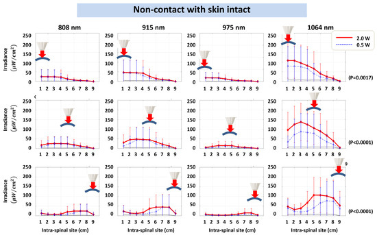 Where the intra-spinal irradiance peaked at a specific probe–tissue configuration was mostly straightforwardly identifiable from the profiles, which had discrete marker overlapped with large range error bars. At a surface power of 0.5 W, corresponding to 157 mW/cm2, the 975 nm light transmitted the least to the nine intra-spinal sites. The 808 nm light transmitted more than the 915 nm, the 975 nm light transmitted more than the 915 nm, and the 1064 nm light transmitted the most.