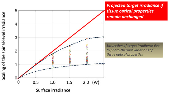 The distribution of irradiance measurements scaled to laser power settings greater than 0.5 W relative to the 0.5 W setting. The data points are positioned below the diagonal line, which represents a perfectly scaled irradiance response to the increase in power setting. The photo-thermal variations of tissue optical properties could cause the target irradiance to saturate as the surface irradiance scales up. The two dashed lines indicate the rough range of the scaling of the spinal-level irradiance.