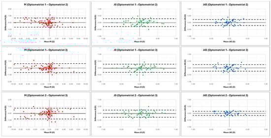 Bland–Altman plots of the total sample in terms of spherical equivalent (M; (left column, red)), vertical cylindrical component (J0; (middle column, green)), and oblique cylindrical component (J45; (right column, blue)) to assess agreement between the three different optometrists. The middle line represents the mean difference between optometrists (bias). The two dotted lines indicate the 95% limits of agreement (precision), which represent the boundary within which 95% of the differences between optometrists are expected to lie.