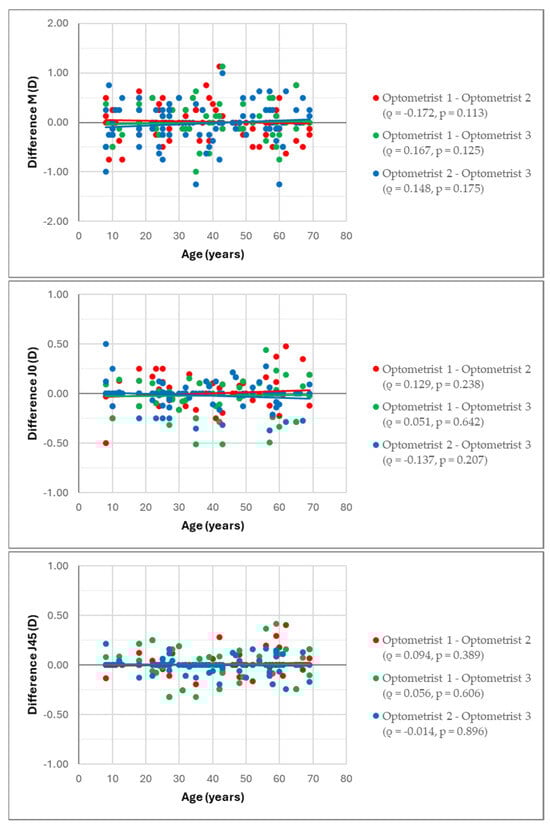 Scatter plots and linear correlations between the age of participants and the mean difference between the optometrists for spherical equivalent (M) and cylindrical components (J0 and J45). The analysis of Spearman’s correlation coefficients (ρ) did not show any statistically significant correlation between these parameters (p ≥ 0.05).