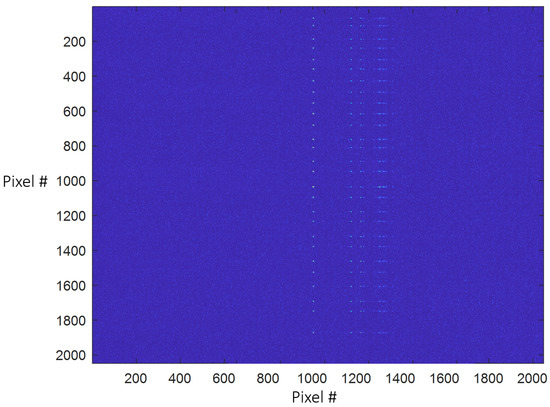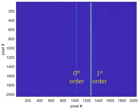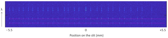 Keystone distortion can be measured by evaluating the straightness of the spectrum in each FOV. It can be accomplished by comparing the position of various wavelengths in a FOV as presented in Figure 11. It is important to mention that the keystone is more observable at the edge of the FOV. Therefore, we aim to measure the keystone near the edges of the FOV. We first measured at the one edge. The center of the PSFs for various wavelengths is perfectly located at pixel row 55, which corresponds to position +5.340 mm on the slit. On the side close to the other edge, the center of the PSFs for various wavelengths is perfectly located at pixel row number 1861, which corresponds to position −4.588 mm on the slit. Moreover, the center of the PSFs for various wavelengths is perfectly located at pixel row 1024 for the center of the FOV. Keystone distortion can also be measured by using a long-slit LPU equipped with a tungsten calibration source that provides a continuous spectrum. The measurement result is presented in Figure 12. The naked eye can observe that the edges of the spectrum appear in a straight line, with sharp straight edges at the top and bottom of the image. The spectrum is cut at the pixel rows 25 and 2024. Therefore, we can confidently say that the Offner prototype is free from keystone distortion.
