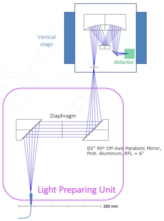 To provide a point source entering the spectrometer slit for characterization, we employed three main components, which are two off-axis parabolic (OAP) mirrors [18] and one iris diaphragm. They are configured as shown in Figure 3. Instead of a refractive system, mirrors are used to avoid chromatic aberration. This approach ensures that various wavelengths are focused at the same position at the entrance slit, allowing better spectral resolution and reliable analysis of the collected data. The focal length of the off-axis parabolic mirror is chosen according to the aperture number of the TSC-1 front telescope. The focal length of the OAPs is equal to 6 inches. In corroborating with a 2-inch diaphragm, the beam aperture is emulated, as provided by an F/3 system. The light is fed by a 25 µm core optical fiber as a part of the LPU. The image provided by this optical system is at the entrance slit level. It is important to mention that this LPU cannot provide an ideal point but a given size corresponding to the optical fiber core. The optical fiber core size is well selected to match the smallest resolvable object by the Offner spectrometer prototype. After the point-object LPU was set up, a detector was placed at the focal point of the LPU to ensure the fiber core was well imaged with no significant aberration due to the LPU. Careful calibration was performed by adjusting the alignment of two OAPs to achieve a sharp and clear image of the fiber core, thereby maintaining the integrity of the light source for subsequent measurements.
