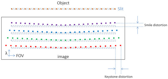 On the other hand, the long-slit fore optics setup can also provide spectral resolution, smile distortion, and keystone distortion across the FOV except for spatial resolution. However, this measurement can be performed within one shot and there is no need to adjust the vertical stage. The schematic result of the long-slit fore optics setup is presented in Figure 6.