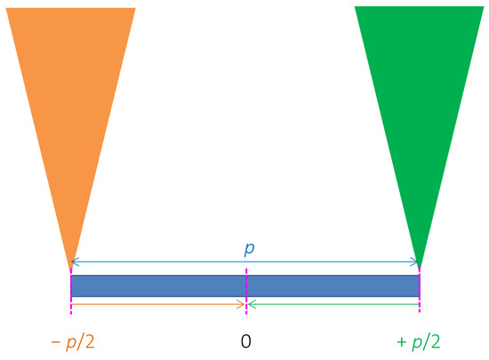 This is the illustration of the mismatch range. The orange wavelength focused on the position (the end edge of the pixel) will be reported as located at the center of the pixel (0). This means the minimum mismatch range is at . On the other hand, the green wavelength that falls on the position (the other end edge of the pixel) will also be reported as located at the center of the pixel (0). This means the maximum mismatch range is at . Therefore, the mismatch range is equal to ±p/2.