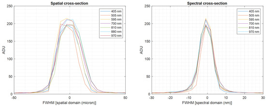 It is noticeable that the FWHM in the spatial direction varies with respect to wavelengths according to diffraction law as shown in Figure 8 left-panel. The FWHM varies from 21.5 µm to 24.10 µm in the spatial domain. However, it is visible that FWHM at 400 nm is higher than at 500 nm. This confirms the simulation on Zemax that the image quality at 400 nm is lower than at 500 nm [1].