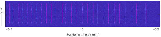 The image of the slit is located at the center of the sensor. In the x-axis, the center of the slit width is at pixel number 1024. The magnification of the spectrometer is equal to 1. Therefore, the image of the 11 mm × 22 µm slit is the same size. In the y-axis, the edge of the upper slit is at pixel number 25. The edge of the lower slit is at pixel number 2024.