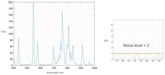 The signal-to-noise ratio (SNR) was evaluated by using the signal from an HgAr lamp spectrum measurement after dark subtraction. The odd number of dark frames, 11 in our case, were acquired with no light on at the same exposure time as the raw data. Then, they were stacked to average the dark signal for each pixel before subtraction. The measurement result for SNR evaluation is presented in Figure 13. The signal equals to 200 Analog-to-Digital Units (ADU) at 550 nm. On the other hand, the noise is evaluated by determining the variance in the no-data zone of the image, which includes the rows numbered 1–24 and 2025–2048, represented in Figure 12 and equal to 2 ADU. Therefore, the SNR is equal to 100 at 550 nm.