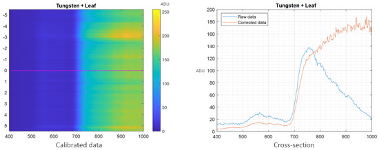 (Left-panel): Calibrated leaf data. (Right-panel): Raw data (blue curve) and calibrated data (orange curve) cross-section at the center of the slit.