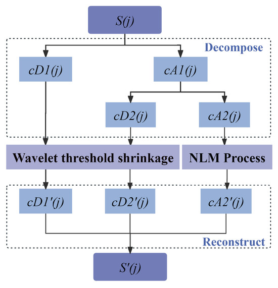 The enhanced DWT-NLM composite method, illustrated in Figure 2, involves decomposing a noisy heartbeat signal into detail coefficients , at two scales and approximation coefficients . High-frequency noise primarily resides in the wavelet detail coefficients of the first and second layers, while low-frequency noise is present in the wavelet approximation coefficients. Leveraging the strengths of DWT and NLM, the detail and approximation coefficients undergo wavelet threshold shrinkage and NLM processing, respectively, resulting in the denoised signal .