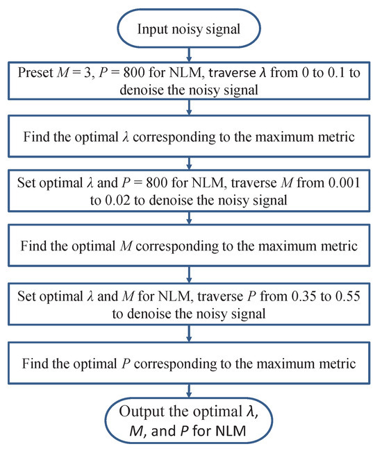 where N denotes the signal length, is the original ECG signal. is the estimated ECG signal. The metric is based on the autocorrelation properties of the signal rather than on noise levels that cannot actually be accurately obtained. Thus, more accurate DWT filter parameters can be obtained, which improves denoising [42]. The optimization process involves determining the optimal parameters for NLM as well, as depicted in the flowchart in Figure 4.