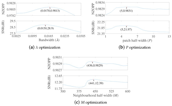 Initially, the neighborhood radius M is set to 3 and the patch radius P to 800. The algorithm traverses through different values of to identify the maximum value of the objective evaluation metric, indicating the optimal . Subsequently, with the optimal and patch radius P fixed at 800, the algorithm varies the M value to maximize the metric, thereby determining the optimal M value. Similarly, the optimal value for P is then obtained. By optimizing all filter parameters in the enhanced DWT-NLM composite method, it is refined to achieve superior denoising performance.