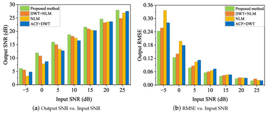 To visually compare the denoising performance of different methods on the cu07 ECG signal corrupted by AGW noise ranging from −5 to 25 dB, the data in Table 1 are represented in a histogram in Figure 6. It evident that the output SNR achieved by the proposed DWT-NLM method surpasses that of other existing methods, while the RMSE is notably lower across different input SNR levels. Notably, the conventional DWT-NLM method may be inferior to the NLM and the improved DWT methods under higher AGW noise levels of 20–25 dB, whereas the enhanced DWT-NLM method significantly outperforms the conventional DWT-NLM method and excels over NLM and improved DWT methods.
