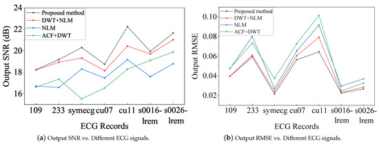 To showcase the effectiveness of the proposed method across different ECG signals, we plotted the enhancement of output SNR for each method listed in Table 1 when denoising ECG signals are corrupted with AGW noise at an input SNR of 10 dB in Figure 7. The results indicate that the output SNRs of the proposed methods surpass those of the compared methods, while the output RMSE values are lower, particularly for the cu11 ECG signal.