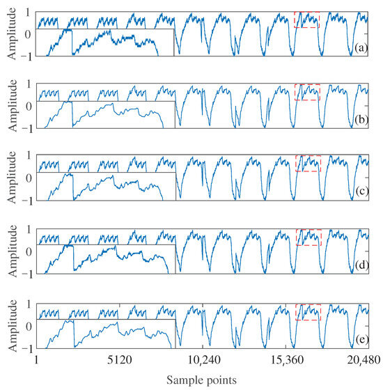 Visual comparison of the denoising effect of multimode fiber sensing heartbeat signals: (a) original signal, (b) proposed method, (c) conventional DWT-NLM, (d) NLM, and (e) improved DWT.