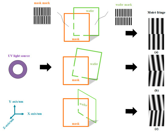 Overlay accuracy is the key factor affecting the productivity of lithography machines [1]. Before performing the overlay process in lithography, it is necessary to determine the alignment between the lithography mask and wafer, and the alignment precision is approximately one-third of the overlay accuracy [2]. The alignment method based on the Moiré fringe is a current research hotspot in alignment systems due to its advantages of a simple measurement optical path and high measurement accuracy [3,4,5,6,7]. During the alignment process, a slight angular misalignment between the mask and wafer will cause the generated Moiré fringe to tilt, thereby affecting the alignment accuracy. Therefore, achieving leveling of the mask and wafer is currently a key research focus.