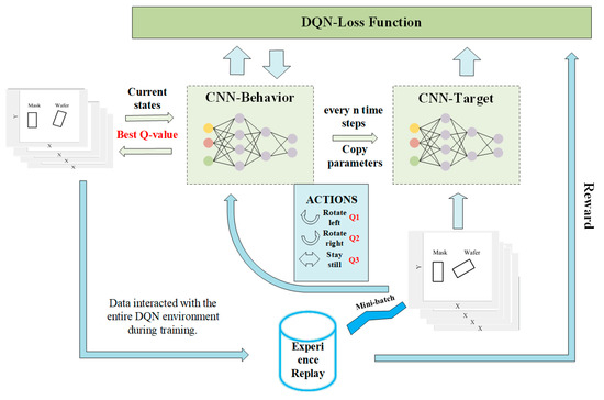 In the Moiré fringe alignment method, when the mask and wafer are tilted, the resulting Moiré image will also be tilted. Generally speaking, the mask is created by numerically analyzing the tilted Moiré fringe. Unlike previous leveling processes between the mask and wafer [8,9,10,11,12,13], our proposed method simulates the tilting state between the mask and wafer, as illustrated in Figure 2. The input consists of four sets of mask and wafer pictures depicting various tilt states as the environmental condition. The picture size is 80 × 80, and four frames are grouped together. The four frames of data are just the initial input data, which is continuously iterated. Initial data are input to CNN-Behavior network training and stored in the experience replay pool. Subsequently, new initial data is taken from the experience pool to replace the original initial data training. In other words, the status between the mask and the wafer is continuously updated during the training process. This enables automatic leveling of the mask and wafer. Since convolutional neural networks (CNNs) excel at modeling complex functions, we utilize a CNN as a function approximator to estimate the Q-value. Essentially, when a state is input, the CNN outputs the Q-values corresponding to all currently executable actions. The Q-value serves as the input value for the Deep Q-Network (DQN) algorithm. The DQN algorithm consists of three main components [16]: the CNN-Behavior network, the CNN-Target network, and the experience replay pool. The CNN-Behavior network is responsible for training the Q-value output by the CNN to produce the optimal state-action value for the agent. The role of the experience replay pool is to interact with various environmental states. After the data are generated, a batch of samples is randomly selected from the data to train the CNN-Behavior network and the CNN-Target network. The initial parameter settings of the CNN-Target network and the CNN-Behavior network are exactly the same. At certain time intervals, the parameters of the CNN-Behavior network are updated and copied to the CNN-Target network. This process helps to maintain the stability of the target Q-value over a short period of time. The overall idea of the DQN algorithm is to observe for a period of time before training the Q-value, collect the data into an experience replay pool, and then use this pool as the training sample data. The number of samples used for training is randomly selected. After the CNN-Behavior network obtains the best action behavior Q-value and interacts with the environmental state, the mask and wafer determine the next action. Then, the next frame information is acquired, the picture is updated, four frames of pictures are compiled as the next state, and the current state is updated. Each cycle generates an optimal action behavior Q-value and then interacts with the environment. The mask and wafer then execute the best action. By connecting these actions in series, the mask and wafer can be automatically leveled.