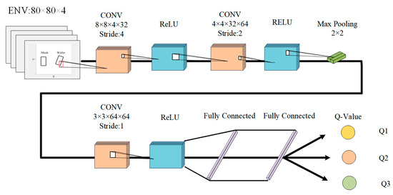 For each convolutional layer, the number of filters is as follows: 32, 64, and 64. A maximum pooling layer (2 × 2, stride 2) is used to reduce the number of parameters, avoid overfitting, and increase the processing speed of the model. Following the last convolutional layer, there are two fully connected layers with units of 512 and 3, respectively. The network uses four-channel 80 × 80 wafer tilt images as the input, and the output is the Q-value represented by all actions.