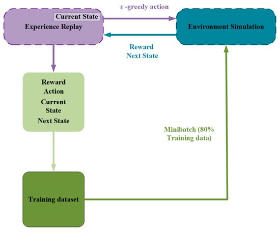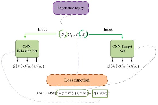 To train the network, the first step is to initialize the experience replay pool as a queue D with a capacity of N. As shown in Figure 4, the experience replay pool selects an action using the ε-greedy strategy [16]. After execution, the system obtains rewards and the next state from the environment, and it then combines the reward function, action, and current state. The latest statuses are stored as training samples, and then a batch of samples is randomly selected for disrupted training. The ε-greedy strategy can be expressed as